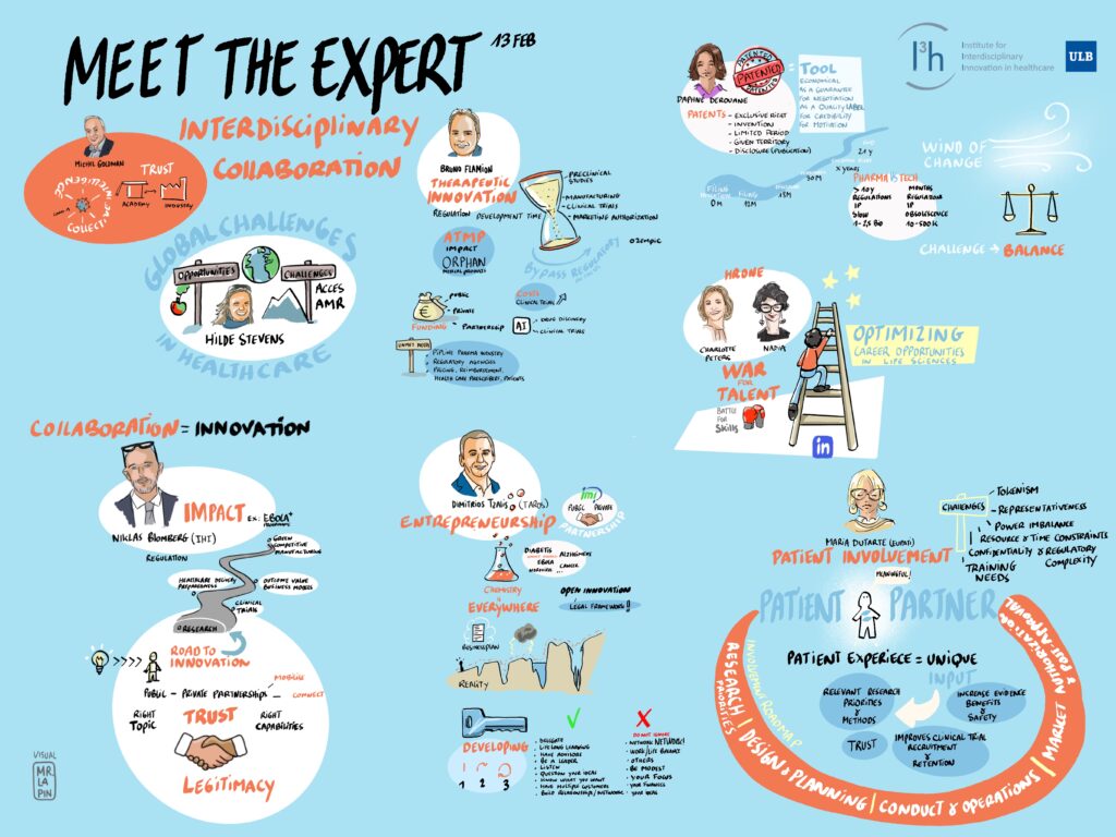 This opening session welcomed a panel of experts and speakers Michel Goldman (I3h Institute, ULB), Hilde Stevens (I3h Institute, ULB), Niklas Blomberg (Innovative Health Initiative – IHI), Bruno Flamion (UNamur / Viatris Innovation), Dimitrios Tzalis (Taros Chemicals GmbH), Daphné Derouane (UCB), Charlotte Peters (HR One) and Maria Dutarte (EUPATI).